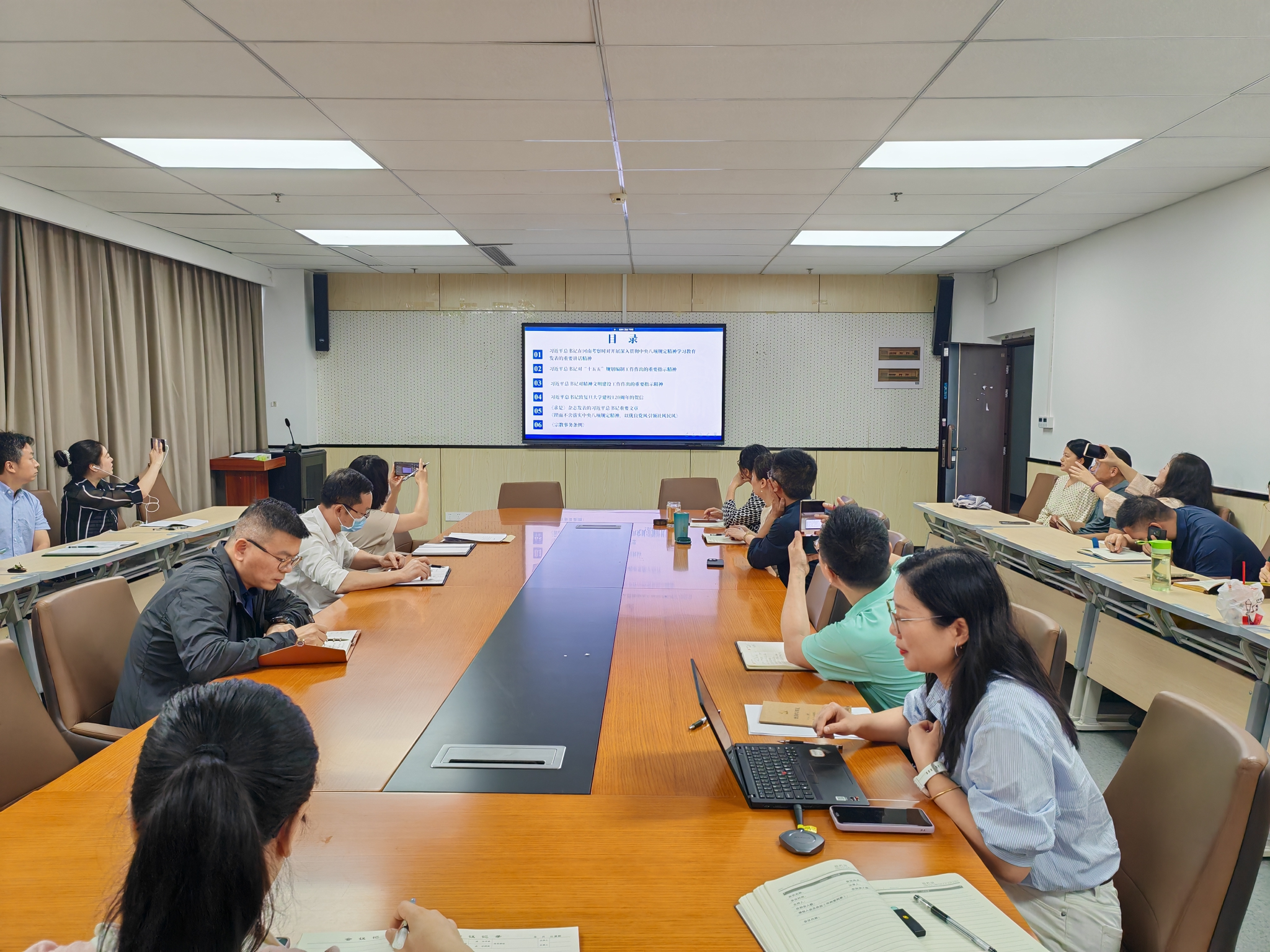 第一阶段,全体教职工系统学习了《习近平总书记在河南考察时对开展深入贯彻中央八项规定精神学习教育发表的重要讲话精神》、《习近平总书记对“十五五”规划编制工作作出的重要指示精神》、《习近平总书记对精神文明建设工作作出的重要指示精神》、《习近平总书记致复旦大学建校120周年的贺信》、《求是》杂志发表的习近平总书记重要文章《锲而不舍落实中央八项规定精神,以优良党风引领社风民风》、《宗教事务条例》等内容。