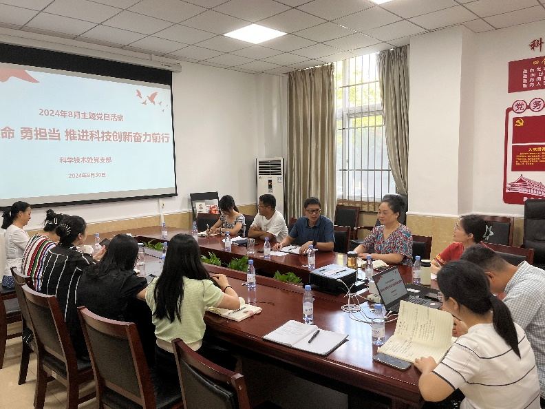 按照机关党委的工作安排,结合本支部工作实际,科学技术处党支部于8月30日下午在科学技术处会议室开展主题为“强使命 勇担当 推进科技创新奋力前行”的主题党日活动。活动由党支部书记段有德同志主持,高新技术办公室导学。