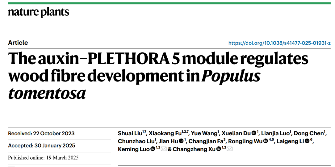 3月19日生命科学学院罗克明、许长征教授团队在《自然植物》(Nature Plants)发表了题为《生长素调控毛白杨木材纤维细胞发育》(The auxin-PLETHORA 5 module regulates wood fibre development in Populus tomentosa)的研究论文。该研究揭示了生长素信号在维管形成层中的核心作用,阐明其如何协同调控木纤维细胞的生长与木质化过程。研究发现,生长素信号通过激活转录因子 PLETHORA 5 (PLT5) 的表达,以非细胞自主性方式调控木纤维细胞次生细胞壁沉积的起始。此外,该研究提出了“生长素-PLT5-SND1”分子调控通路,为解析木材形成过程中细胞分化的时序调控机制提供了重要证据。