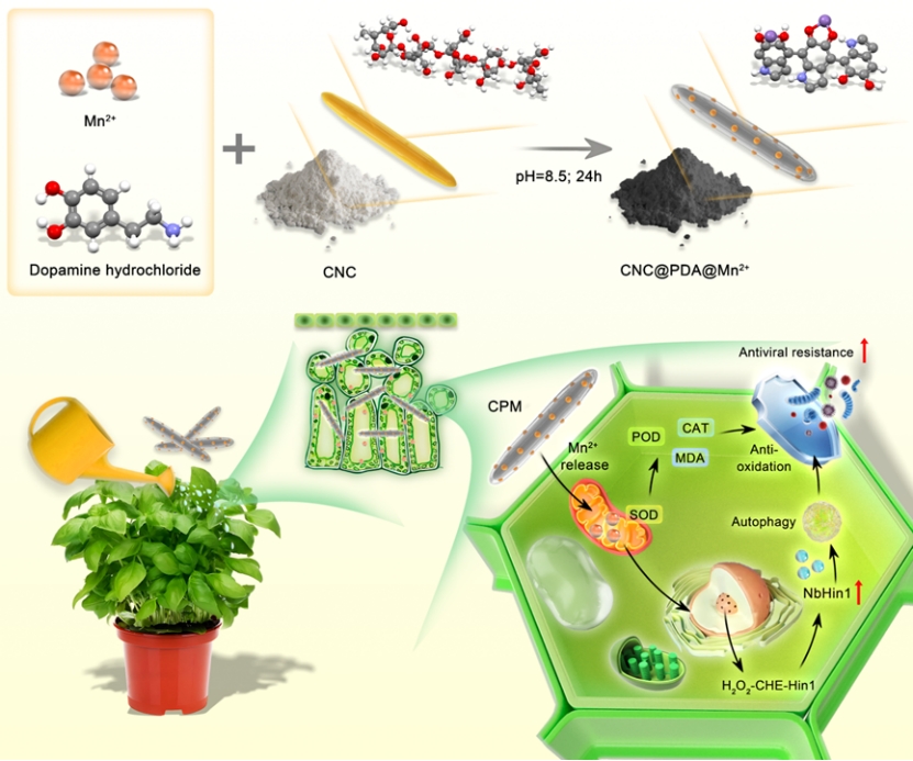 本研究开发了一种以纤维素纳米晶(CNC)为载体、聚多巴胺(PDA)螯合Mn2+的新型粒子型纳米农药(CPM),显著提升了Mn2+的靶向递送效率与生物利用度。在相较传统游离Mn2+大幅降低使用浓度的前提下,CPM在植物体内展现出优异的抗病毒性能,有效兼顾防控效率与生物安全性。