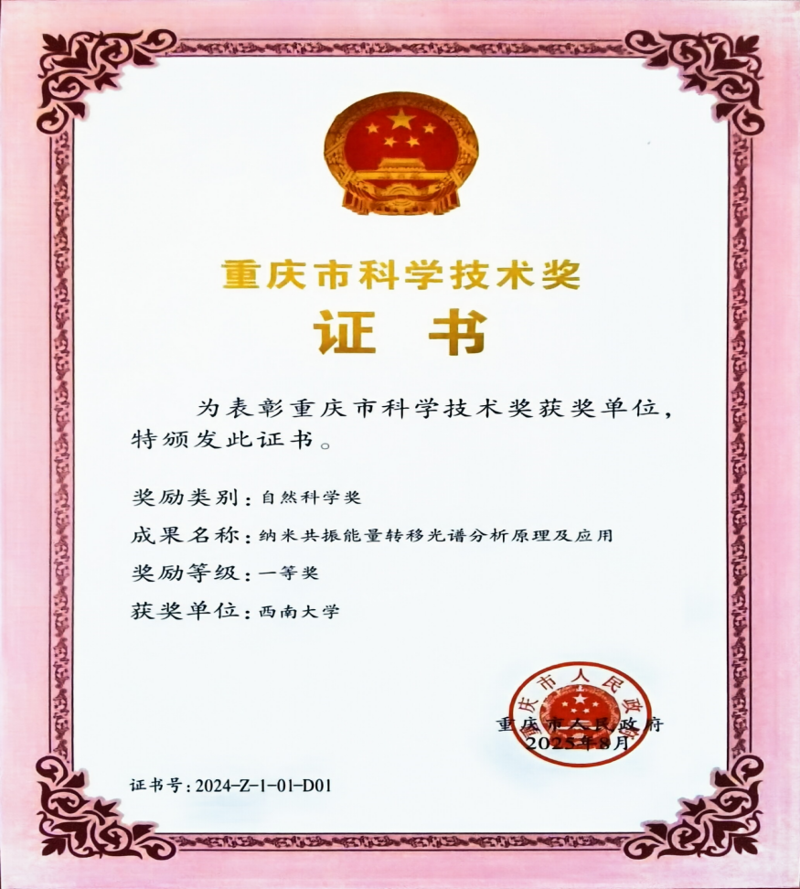 2024年度重庆市科学技术奖正式公布。学校药学院·中医药学院黄承志教授团队牵头,联合北京大学申报的“纳米共振能量转移光谱分析原理及应用”荣获2024年度重庆市自然科学奖一等奖。