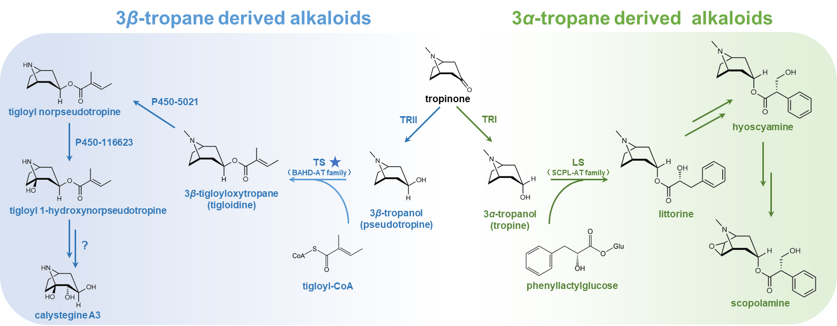 托品烷生物碱(tropane alkaloids, TAs)是一类以托品烷环为特征的植物次生代谢产物。其中托品衍生的代表性化合物莨菪碱和东莨菪碱为抗胆碱基本药物,用于麻醉镇痛、止咳平喘、舒缓胃肠不适、治疗晕动症、缓解近视和解除有机磷农药中毒等。近年来,廖志华团队在托品及其衍生物的生物合成途径解析、演化机制与生物制造方面开展了大量创新性研究工作(参考文献1~8)。茄科植物中还广泛分布着另一类TAs,即假托品衍生物,如惕佫酰假托品(3β-tigloyloxytropane)和打碗花精(calystegine)。惕佫酰假托品,也叫惕佫列定(tigloidine)或托品林(tropigline),可用于帕金森症等神经退行性疾病的治疗;打碗花精具有强烈的糖苷酶抑制剂活性,可用于代谢综合症的治疗。目前对假托品衍生物生物合成的了解非常有限,利用代谢工程或合成生物技术高效生产这些有价值的假托品衍生物也因此受限。