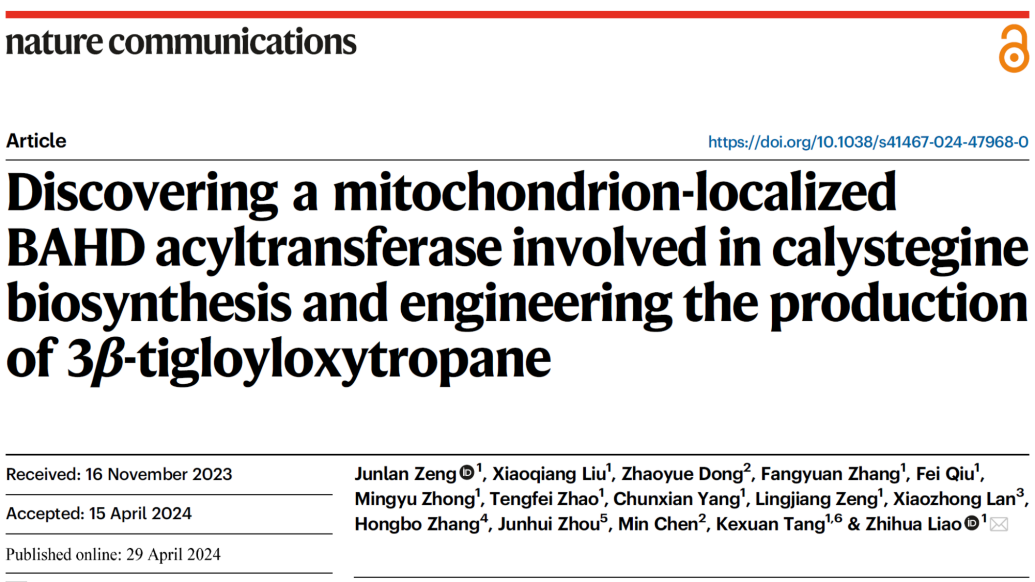2024年4月29日,廖志华教授团队在Nature Communications上发表了题为《Discovering a mitochondrion-localised BAHD acyltransferase involved in calystegine biosynthesis and engineering the production of 3β-tigloyloxytropane》的研究论文。该研究鉴定了一个定位于线粒体的BAHD-AT,即惕佫酰假托品合成酶(3β-Tigloyloxytropane Synthase,TS),证明其参与了打碗花精的生物合成,进而揭示了TS的催化机制并改善其催化活性,随后在大肠杆菌中实现了惕佫酰假托品的高效生物制造。该研究进一步完善了TAs生物合成理论,为假托品酯化物的生物制造提供了必需功能基因,丰富了对BAHD-AT亚细胞定位和催化机制的认识,并最终实现了神经退行性疾病治疗药物惕佫酰假托品的高效生物制造。
