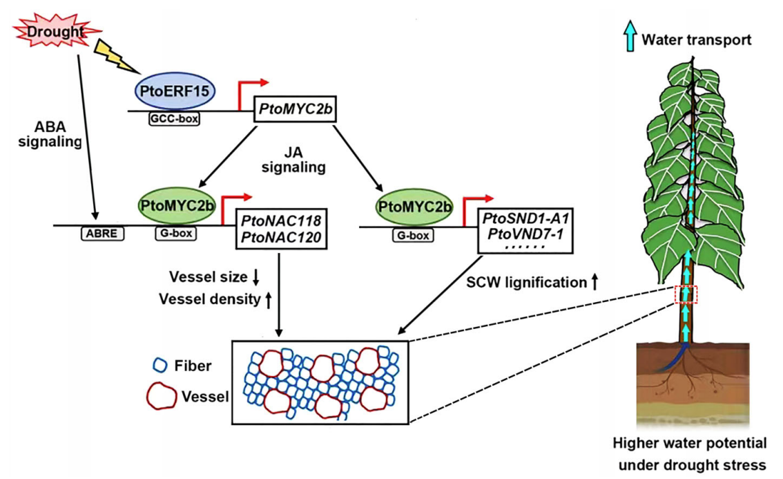 Fig.2 Model of the PtoERF15-PtoMYC2b cascade modulates drought tolerance by regulating vessel morphology in Populus.