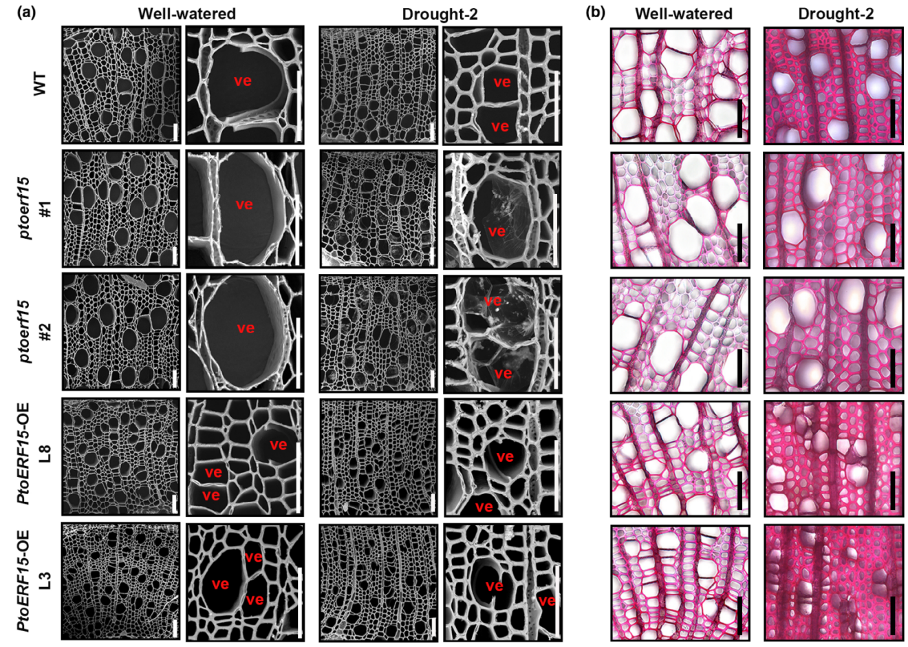 Fig.1 PtoERF15 regulates xylem morphology and lignin deposition in Populus tomentosa under drought stress. Cross-sections were observed with a scanning electron microscope (SEM) (a) and Lignin-specific histochemical staining (b) in 3-month-old wild-type (WT), ptoerf15, and PtoERF15-OE poplar under well-watered conditions and drought stage 2.