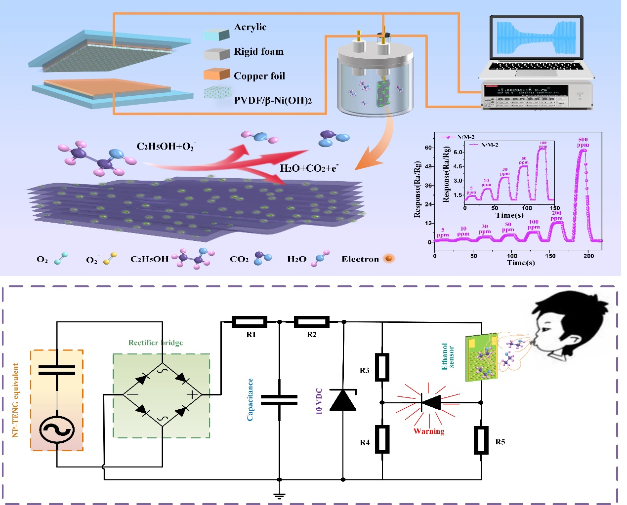 图1. 由NP-TENG驱动的自供能乙醇传感系统(NNES)示意图。