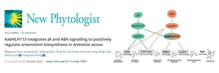 近日,PA视讯官网廖志华教授团队在New Phytologist(新植物学家)发表了题为 “AabHLH113 integrates JA and ABA signalling to positively regulate artemisinin biosynthesis in Artemisia annua”(AabHLH113整合JA和ABA信号正调控青蒿素生物合成)的研究论文。该研究发现青蒿转录因子AabHLH113受到JA和ABA诱导,能直接转录激活青蒿素生物合成基因DBR2和ALDH1,过表达/干扰AabHLH13能够显著提高/降低青蒿素含量。廖志华教授团队先前发现AabZIP1是ABA信号通路调控青蒿素生物合成的关键转录因子(Zhang et al. Molecular Plant. 2015);AabHLH112是响应JA信号调控青蒿素生物合成的重要转录因子(Xiang et al. Journal of Experimental Botany. 2019)。在这次研究中,进一步发现AabZIP1和AabHLH112均能够直接转录激活AabHLH113。综上所述,AabHLH113在整合JA和ABA信号调控青蒿素生物合成中发挥了关键作用。该论文通讯作者为张芳源副教授和廖志华教授。