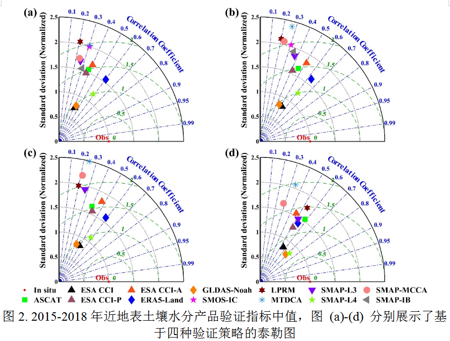 江苏省作为我国产粮大省,准确的近地表和根系土壤水分数据对促进耕地用水管理具有重要意义。受制于有限的站点观测数据,该省的土壤水分产品验证工作尚未完全展开。本研究基于江苏省2011-2018年的91个站点的连续观测数据(图1),结合站点直接验证和Triple Collocation Analysis (TCA) 方法,利用不同的验证策略对17套近地表及根系土壤水分产品精度进行了验证。结果表明:对近地表土壤水分而言,再分析土壤水分产品 (ERA5-Land, SMAP-L4, , GLDAS-Noah) 和遥感融合土壤水分产品 (ESA CCI Combined/Passive/Active) 精度优于主、被动微波土壤水分产品(图2)。对根系土壤水分产品而言,ERA5-Land, SMAP-L4和ESA CCI精度优于GLDAS-Noah。