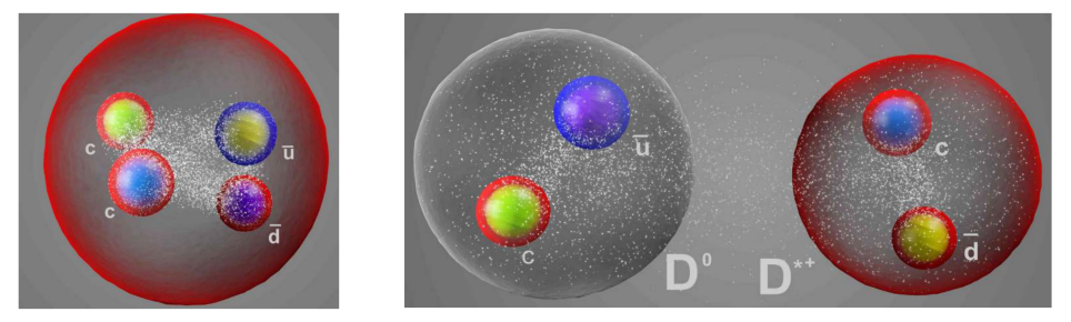 2022年,LHCb合作组在Nature Physics报道了包含两个粲夸克的Tcc四夸克态, 它的质量比D*+D0低273keV, 宽度为(410±163)keV。根据不确定性原理,窄宽度意味着具有较长的寿命。Tcc的质量,宽度和衰变行为均提示它很可能是一个类似于氘核的松散分子态。Tcc是人类首次发现包含了两个粲夸克的奇特强子态,它的独特的性质将有助于我们理解低能强相互作用。