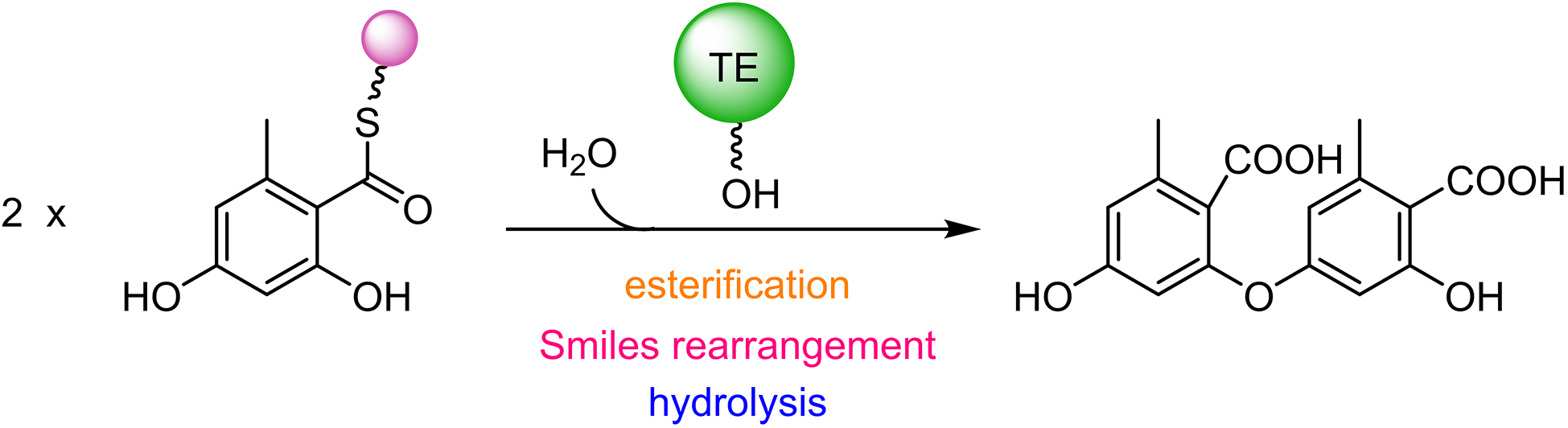 前期已报道二芳基醚的酶学合成方法依赖于氧化反应,比如:细胞色素P450氧化酶催化的自由基偶联或加成反应和铜依赖氧化酶催化的氧化重排反应。自然界中,是否存在二芳基醚的非氧化合成方法,一直是未解之谜。针对这一重要科学问题,本研究通过详细分析与系统验证,发现了真菌非还原性聚酮合酶AN7909的硫酯酶结构域(thioesterase domain,TE domain),可以罕见地连续催化酯化、Smiles重排和水解等一系列非氧化反应,高效构建二芳基醚药物骨架。整个催化过程并不需要额外氧化酶的参与,且不需要提供氧化反应辅因子。通过合成一系列底物结构类似物和酶催化活性位点的定点突变等实验,不但揭示了TE domain的可能催化机理,而且创新性地实现了碳-硫醚键(C-S-C)型二芳基醚骨架的高效合成。