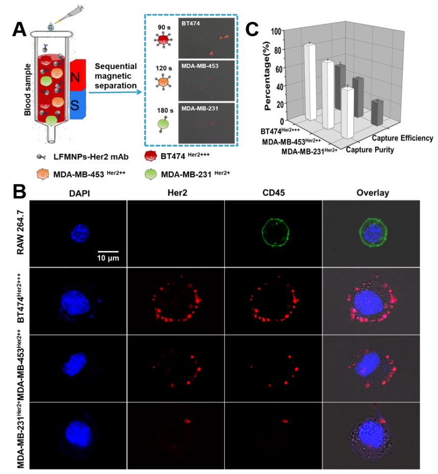 肿瘤细胞异质性是肿瘤异质性的重要成因之一,可导致肿瘤在增殖能力、侵袭能力和药物敏感性等方面产生重要差异,影响肿瘤的诊断与治疗,最终影响患者身体健康与生命安全。因此,肿瘤细胞异质性研究对于肿瘤的诊断和个体化治疗具有重要意义。而进行肿瘤细胞亚群分离分析是研究肿瘤细胞异质性的重要基础。现有的基于电泳、场流或荧光激活式分离原理的进行肿瘤细胞分离分析的策略存在着特异性差、操作繁琐或需样本量大等弊端。基于课题组在磁性梯度分离细菌、肿瘤标志物、蛋白分析等方面前期工作(Analytical Chemistry 2018, 90, 9621-9628;Analytical Chemistry 2014, 86, 9434-9442;Chemistry-A European Journal 2014, 20,14642-14649),该研究以细胞表面标志物Her2表达量差异化的三种乳腺癌细胞(BT474、MDA-MB-453和MDA-MB-231)为研究模型,通过荧光-磁性靶向仿生探针与其识别后形成不同磁性梯度,在恒定外磁场作用下,可分别在90 s、120 s和180 s时间内快速逐一梯度分离出三种不同乳腺癌细胞亚型,并基于探针的荧光信号对肿瘤细胞亚群进行了初步鉴定。该研究报道的基于磁性梯度响应的肿瘤细胞亚群分离分析策略具有简单、快速、准确等特点,为血液样本中异质性肿瘤细胞亚群的近同时分离与分析提供新思路,在肿瘤早期诊断、评估和预后方面具有重要的潜在应用前景。