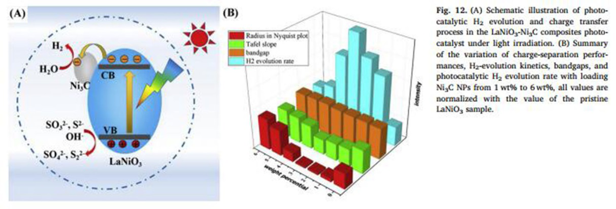 该工作首次尝试在氧化物主体材料上(LaNiO3)利用碳化物(Ni3C)替代贵金属Pt作为助催化剂,利用溶剂热法成功制备了LaNiO3-Ni3C复合样品。研究发现引入Ni3C能显著提升样品中电子空穴对的空间分离效率,并增强光生电子向材料表面迁移的速率和表面析氢反应性能,最终可实现对样品的光催化析氢性能的显著提升。该工作还详细研究了液相合成体系下Ni3C所需要的还原性环境对LaNiO3的腐蚀情况以及相应地对光催化析氢过程的影响,发现在控制碳化物的含量情况下,碳化物合成所需的还原性环境对氧化物的腐蚀是完全可控的。该工作可为后续研究高效率、高稳定性、对环境友好型的光催化纳米材料提供新的思路和参考。