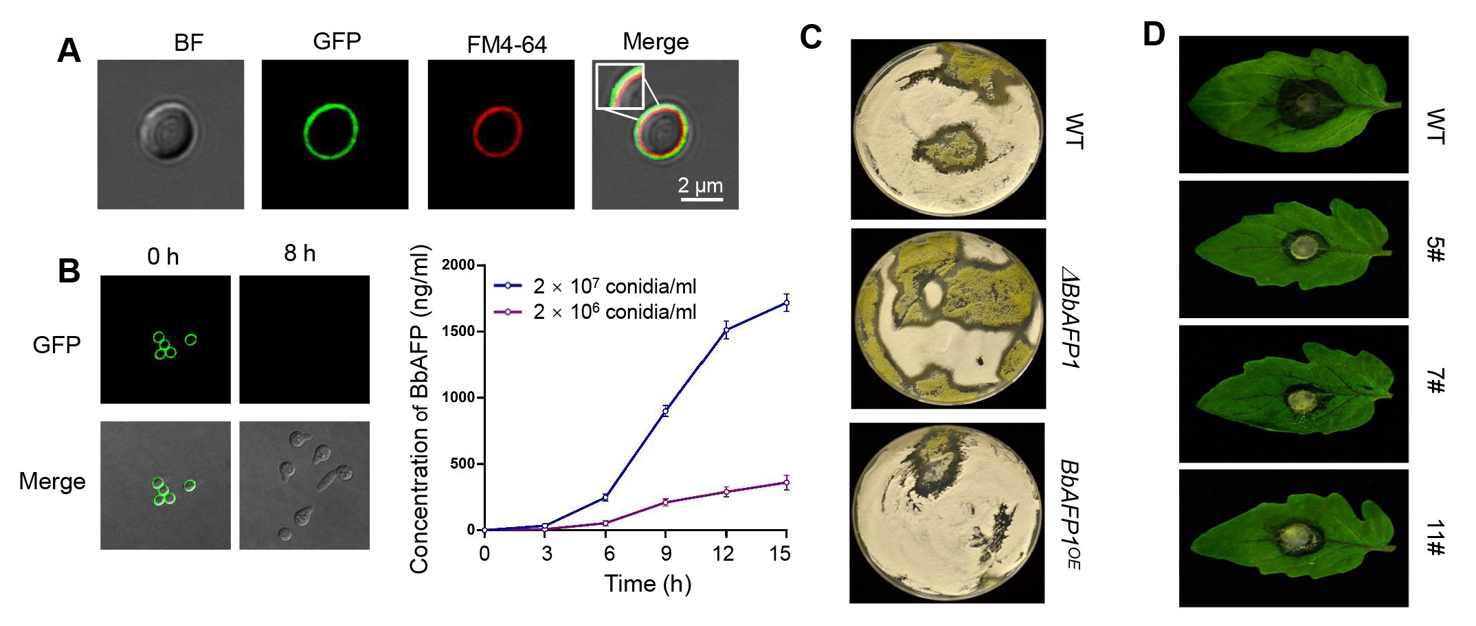 球孢白僵菌在孢子成熟期表达抗菌肽BbAFP-1,并预装在孢子细胞壁上(A,绿色信号所示)。当孢子达到适宜的环境,释放抗菌肽到环境中,孢子开始萌发(B),抑制可能遇到的其它真菌的生长。将球孢白僵菌菌株与其它真菌共培养,缺失抗菌肽基因菌株对环境真菌(绿色所示)的抑制能力降低,而超量表达菌株的抑制能力则显著提高(C)。将该抗菌肽基因在番茄中表达,提高了植株的抗病能力(D)。