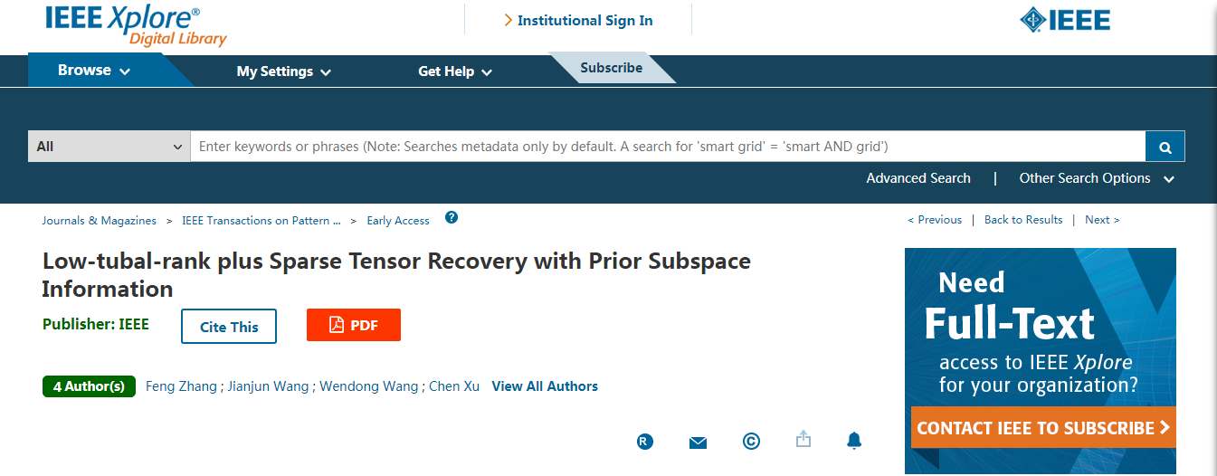 近日,人工智能学院王建军研究员团队在人工智能领域---高维复杂张量数据分析取得重要进展,以“Low-tubal-rank plus Sparse Tensor Recovery with Prior Subspace Information(耦合子空间先验信息的低管秩与稀疏张量恢复)”为题的研究论文被国际顶级期刊IEEE Transactions on Pattern Analysis and Machine Intelligence(IEEE TPAMI)(《IEEE模式分析与机器智能汇刊》)录用为长文(Regular Paper)并已在线发表。IEEE TPAMI是人工智能、模式识别、计算机视觉及机器学习领域国际最顶级期刊,是中国计算机学会(CCF)推荐的为数不多的人工智能领域A类期刊之一。数学与统计学院博士研究生张枫为该论文的第一作者,王建军研究员为该论文的通讯作者。根据Web of Science的检索结果,这是我校首次以第一完成单位在IEEE TPAMI上发表研究论文。