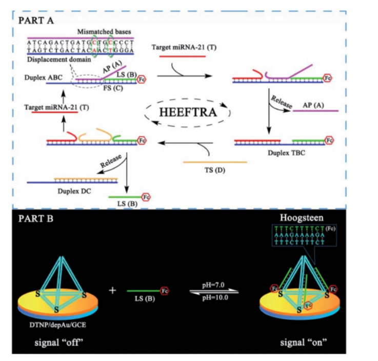 第一个研究工作题目为:“Programmable mismatch-fueled high-efficiency DNA signal converter” ,该研究设计了一种可控的错配驱动的高效DNA信号转换器,并成功构建电化学生物传感器实现了对癌症标志物MiRNA的超灵敏检测。