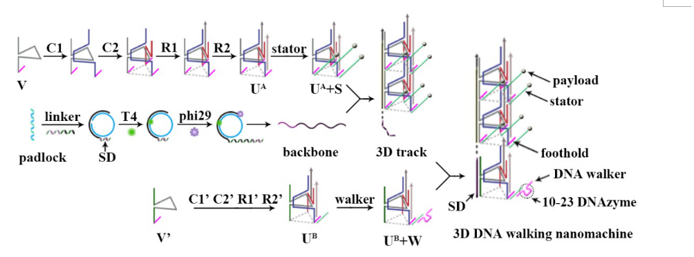 第二个研究工作题目为:“A well-directional three-dimensional DNA walking nanomachine that runs in an orderly manner”,该工作设计了一个三维(3D) DNA纳米步行器,创新地构建了一个功能化的3D DNA轨道,使得DNA步行器方向可控、有序的沿轨道行走执行检测或药物输送。