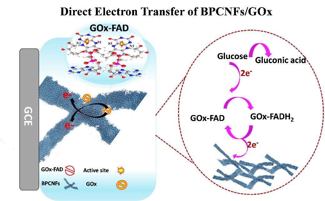 迄今为止,对于直接电化学的机理研究,学界仍然存在争议。在本研究中,通过调控碳化温度来实现富介孔碳纳米纤维(BPCNFs)材料的孔机构,并将该材料用于GOx的固定。在N2饱和及Air饱和的PBS中进行电化学CV循环,通过对氧化还原峰电流的观察,可以发现富介孔BPCNFs材料对GOx具有良好的固定作用,并且能够实现较明显的直接电化学过程;而且BET孔径吸附脱附曲线分析表明,材料介孔率与碳化温度密切相关。该工作为生物传感和生物电化学领域中如何设计优化多孔材料的孔结构,有效地提高目标分子的吸附或负载,实现快速Direct Electron Transfer(DET)工艺提供了可靠的基础和新颖的概念。