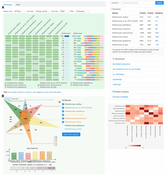 同源基因可分为两大类:直系同源基因和旁系同源基因。直系同源基因起源于共同的祖先,如果物种间的直系同源基因显示高度的序列相似性,则它们可能具有相似的生物学功能。另一方面,在进化分歧较大的物种间的直系同源基因可能发挥不同的功能。近年来,鉴定直系同源基因并确定它们之间的相似程度是比较基因组学研究中理解基因和基因组进化的重要内容。目前已经开发了两种用于鉴定直系同源基因的基本方法。第一种是基于树的,如PhyloTreePruner和TreeFam等工具。第二种是基于图形的,如PanOCT,OrthoFinder,OrthoMCL,OrthoDB,OMA和Roary等工具。基于树和基于图的算法在许多方面都不同,并且每个算法都有其自身的优势。然而这些工具基本基于Linux系统,对其他操作系统用户不友好,缺乏可视化功能,对结果展示不够清晰明了。