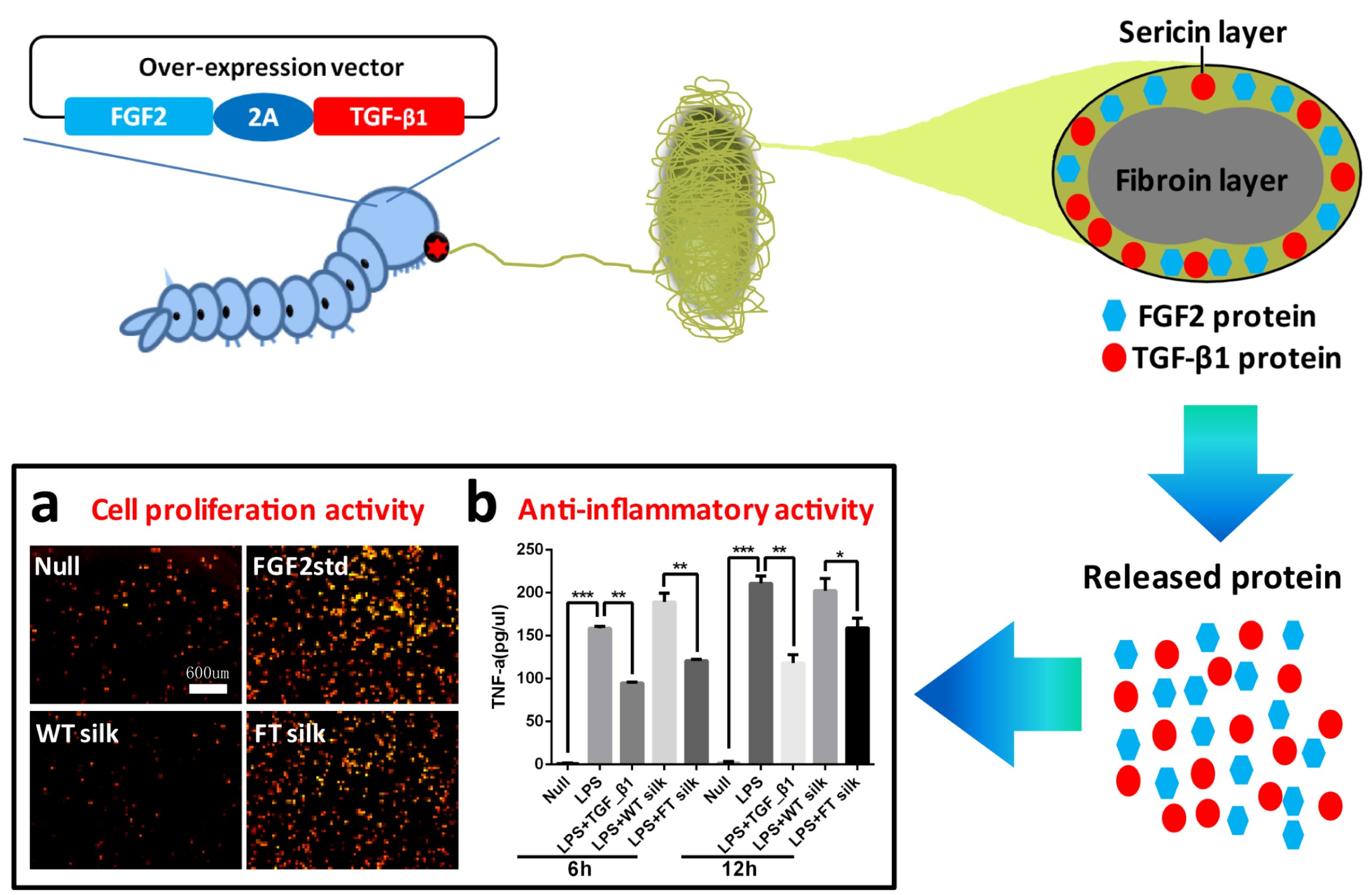 蚕丝是一种性能优异的蛋白纤维,被广泛应用于纺织服装领域。作为一种天然的高分子蛋白,蚕丝蛋白在材料学领域也有广泛的应用前景。12月24日,生物材料领域顶级杂志Acta Biomaterialia在线发表学校前沿交叉学科研究院生物学研究中心、重庆市蚕丝纤维新材料工程技术中心研发人员题为“Genetically engineered bi-functional silk material with improved cell proliferation and anti-inflammatory activity for medical application” (遗传改良具有促细胞增殖与抗炎双功能的新型蚕丝材料)的研究论文。