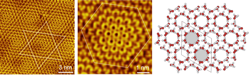 王俊忠教授课题组利用低温生长和后期退火方法制备出二维冰膜,并发现水分子在石墨衬底上能够形成一种新的高密度冰。高分辨的STM图表明,这种高密度的单层冰是由众多的水六聚体自组装而成,每个六聚体表现为独立的六元环结构(如图所示)。相邻的六元环平行排列但不共边,非常类似于水的高压相:冰-II。这意味着利用简单的表面吸附手段,就可以制备出水的高压结构。同时,王俊忠教授组指出这种单层冰与悬浮的二维石墨烯非常类似。在STM针尖的操纵下,单层冰可以在石墨衬底上滑动或转动,甚至可以跨越衬底的台阶而不发生断裂,具有良好的韧性。通过第一原理计算和分子动力学模拟,他们发现石墨衬底和冰单层之间存在非常强的层间吸引力,相当于8000个大气压。水分子也就是在此力的作用下形成了类似于高压相冰-II的单层冰。这些研究成果启示人们可以利用表面效应来制备高密度冰和新型二维材料。