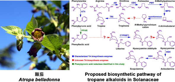 廖志华教授团队采用多学科研究手段,从茄科药用植物颠茄Atropa belladonna中分离鉴定了苯丙酮酸还原酶基因AbPPAR,该基因在须根的中柱鞘和内皮层特异表达,其蛋白质能够高效催化苯丙酮酸还原为苯乳酸,在转基因发根中抑制该基因表达,导致苯乳酸和TAs生物合成极大幅度降低,相关结果证实了AbPPAR参与TAs生物合成。AbPPAR的发现及功能解析进一步完善了TAs生物合成途径,为采用合成生物学技术生产TAs提供了重要的必需基因。该研究得到国家自然科学基金资助,相关研究论文“A Phenylpyruvic Acid Reductase Is Required for Biosynthesis of Tropane Alkaloids”(苯丙酮酸还原酶参与托品烷类生物碱生物合成)发表在国际著名期刊《Organic Letters》,植物学博士生邱飞为该论文的第一作者,廖志华教授为通讯作者。