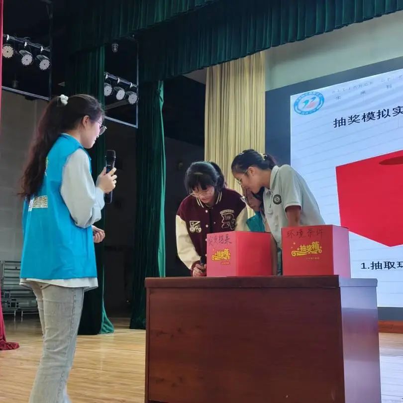 讲解吴明珠院士选育瓜果的知识后,王怡霖和志愿者老师进行了实验环节。实验通过模拟诱变育种,用抽奖箱代表随机性。