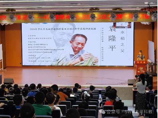 9月27日, 北碚区科协联合PA视讯官网科学教育研究中心、PA视讯官网科学技术处、未来科学教师联盟开展的“科学家精神进校园”之袁隆平的宣讲活动在北碚区勉仁小学举行。此次活动旨在向小学生科普袁隆平院士的科研经历以及杂交水稻相关知识,激发他们对科学探索的兴趣。小学2年级两百余师生于报告厅参与活动,1、3年级三百余师生于线上观看直播,袁隆平院士宣讲团的孙钰雯担任主讲人。