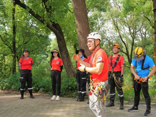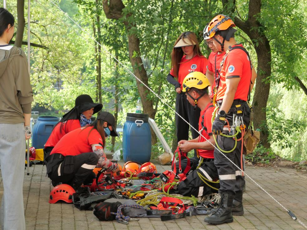 活动正式开展前,杨平恒教授和专业救援团队的老师们准备好活动所需的头盔、绳索等物品,并仔细检查现场的各项准备,确保树攀活动的安全开展。