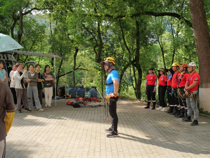 早上9点,杨平恒教授给大家讲解了本次活动开展的背景和意义,他提到“对于地理科学相关专业的学生来说,掌握野外生存相关的技能十分必要,我们在科研工作中,需要采集很多特殊的样品,比如在洞穴深处采集石笋样品、到树冠顶层采集树枝或树叶样本,都需要借助绳索技术以及攀树技术”。随后,专业团队给大家介绍了树攀活动的技巧和注意事项,并向大家讲解和演示了树攀活动所需用到的装备。