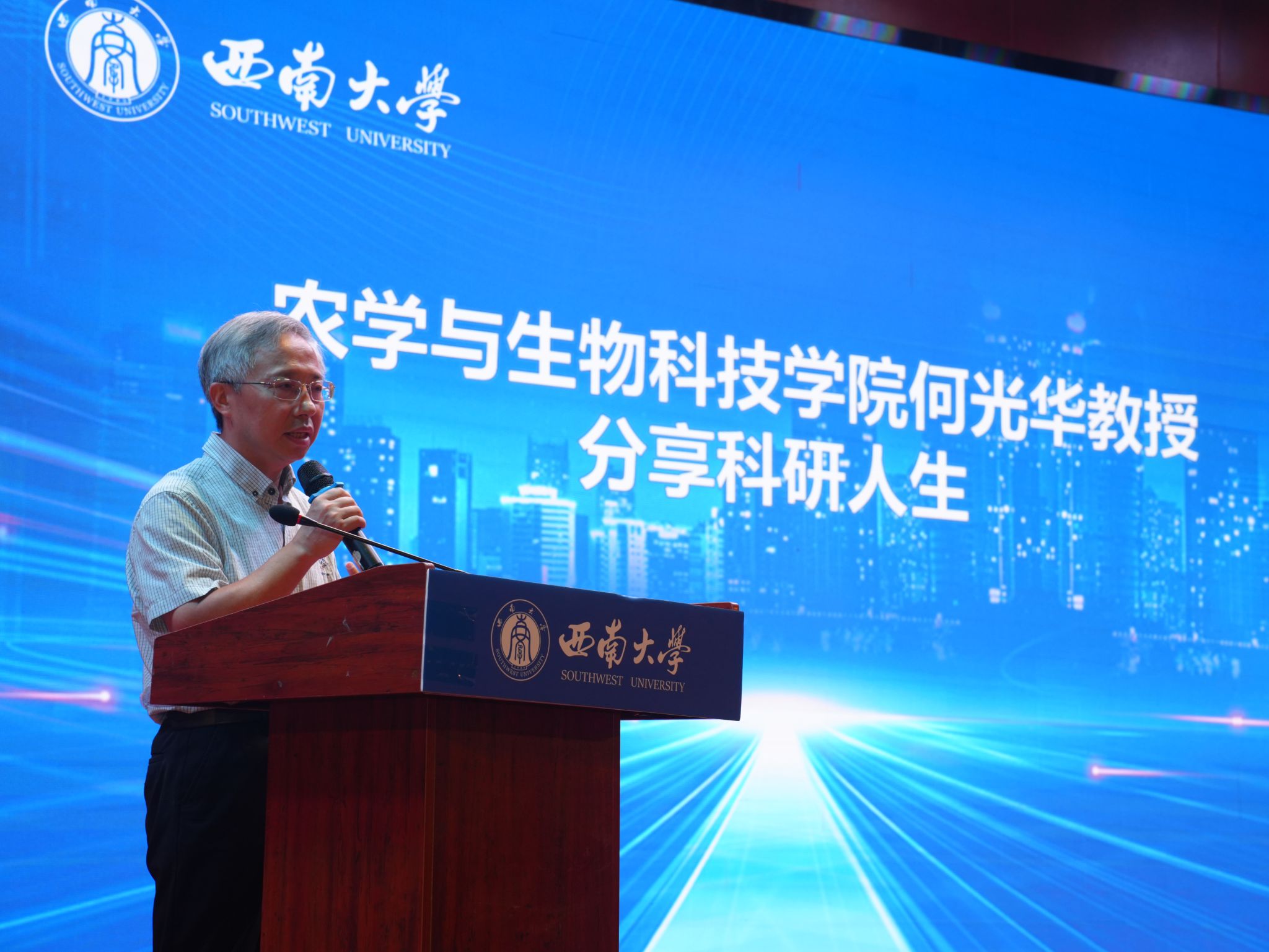 随后播放的访谈纪录片《科学家开麦啦!——热浪中的“追穗人”》展现了全国先进工作者、农学与生物科技学院何光华教授团队奋战在稻田一线、守护粮食安全的科研坚守。何光华教授在发言中勉励青年学子要结合国家需求,秉持创新、努力、坚持、团队协作精神开展科研,把科研成果转化为解决实际问题的智慧与力量。