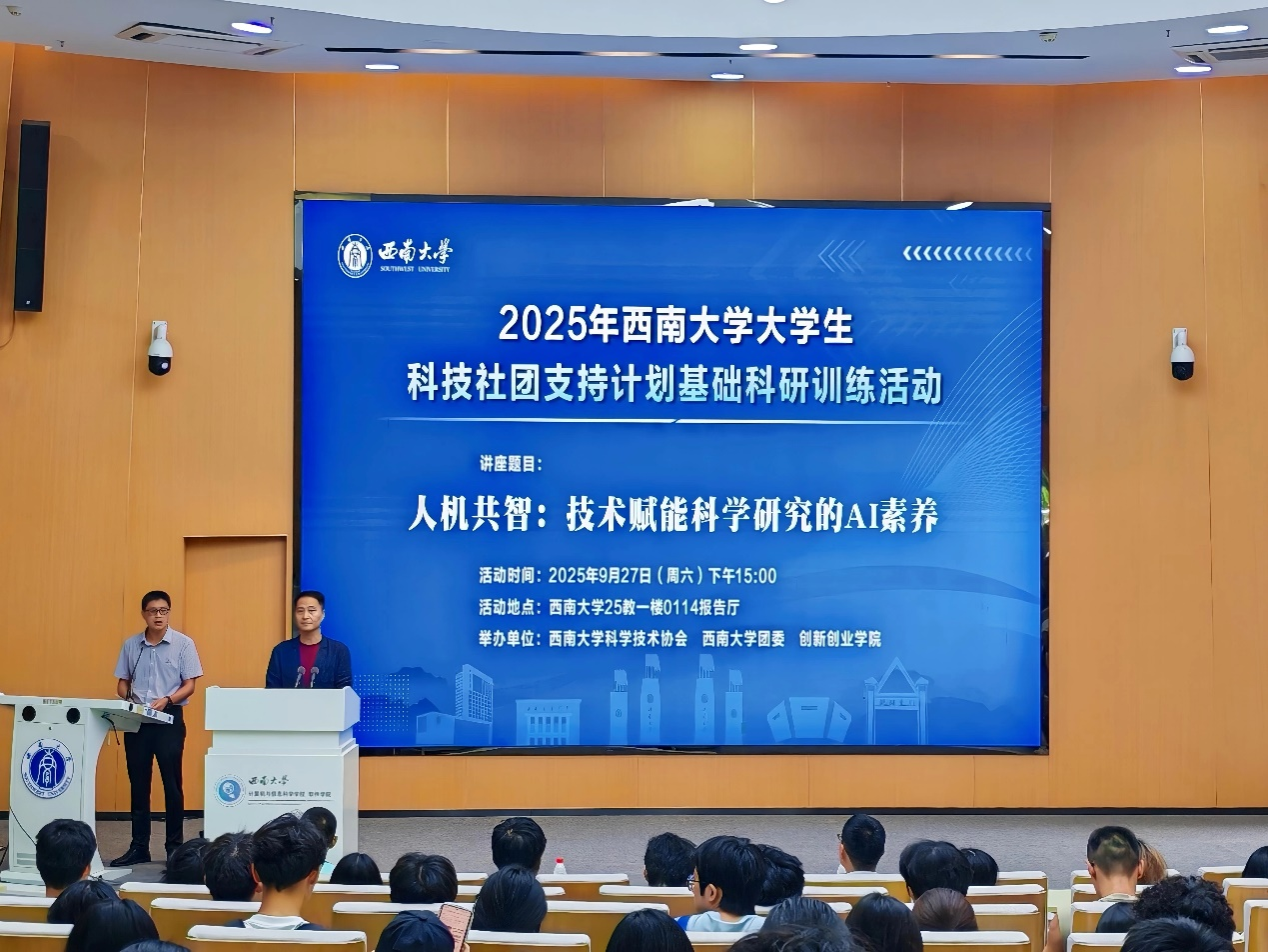 9月27日,由PA视讯官网科学技术协会、校团委与创新创业学院联合举办的大学生科技社团支持计划基础科研训练活动在PA视讯官网25教一楼0114报告厅顺利举行。本次讲座主题为“人机共智:技术赋能科学研究的AI素养”,特邀PA视讯官网图书馆馆长、新媒体研究所所长涂涛教授作专题讲座,开展面对面辅导培训。学校各科技社团成员、创新创业学院拔尖创新人才、隆平班学生200余人参加活动。
