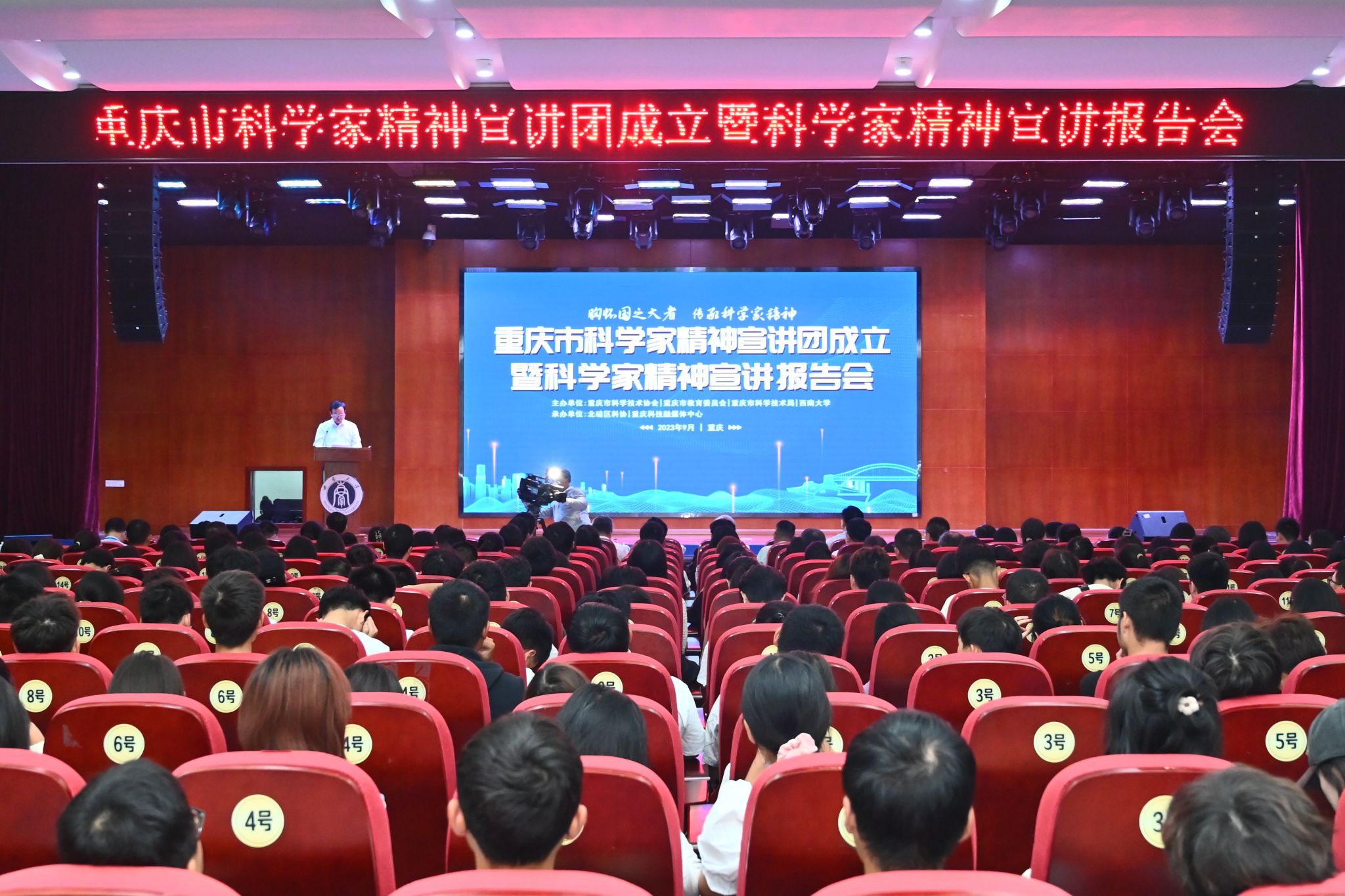 9月27日,重庆市科学家精神宣讲团成立暨科学家精神宣讲报告会在南区学生活动中心举办。重庆市科协党组书记、副主席李雷霆,重庆市科技局党委委员、二级巡视员吴序,市教委二级巡视员谯建,重庆市科协党组成员、副主席谭明星,学校党委书记李旭锋,党委副书记、纪委书记夏玉峰以及科学技术处等有关部门负责人出席会议。