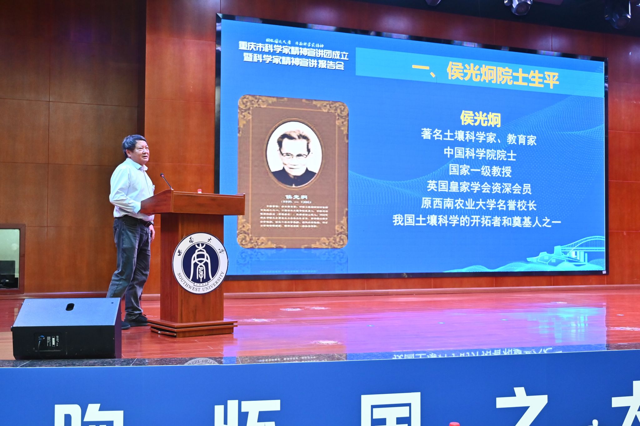 报告会上,学校资源环境学院谢德体教授作了题为《大地之子——侯光炯院士的科学人生》的宣讲报告,从生平、学术贡献、教书育人等方面,全面展现了侯光炯院士坚定农业救国理想、立志“粉身碎骨以报党、脚踏实地做科研”的一生,以及他爱国奉献、求实创新、教书育人的动人事迹。