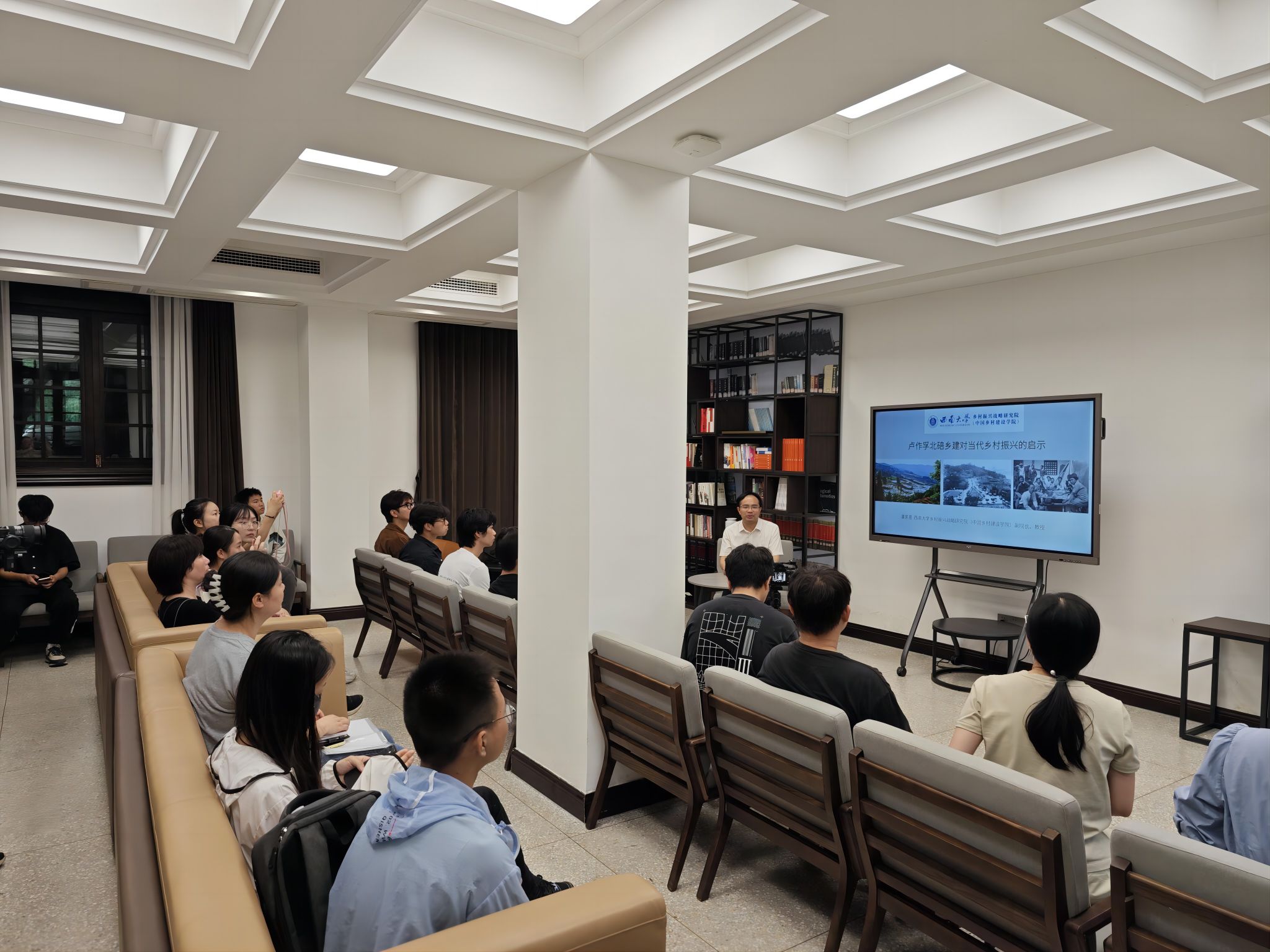 潘家恩教授与同学们共研共学,通过学习陶行知学习的故事、习近平关于“三农”工作论述摘编、观看《百年乡建》视频,引出民族要复兴,乡村必振兴,乡村振兴是我国应对百年未有之大变局,实现民族伟大复兴的必经之路。从“城乡事业 全域开发”“农文旅融合的早期实践”“社会企业与乡村建设的融合”“社会组织与教育的融合”“内外融合:外发促内生与内联促外引”等五个方面,讲解了百年乡建的一波三折,以及乡村复兴的历史机遇。引导同学们用整体思维走进卢作孚先生的乡村建设事业,以全新视角了解其对当代乡村振兴的现实启示。