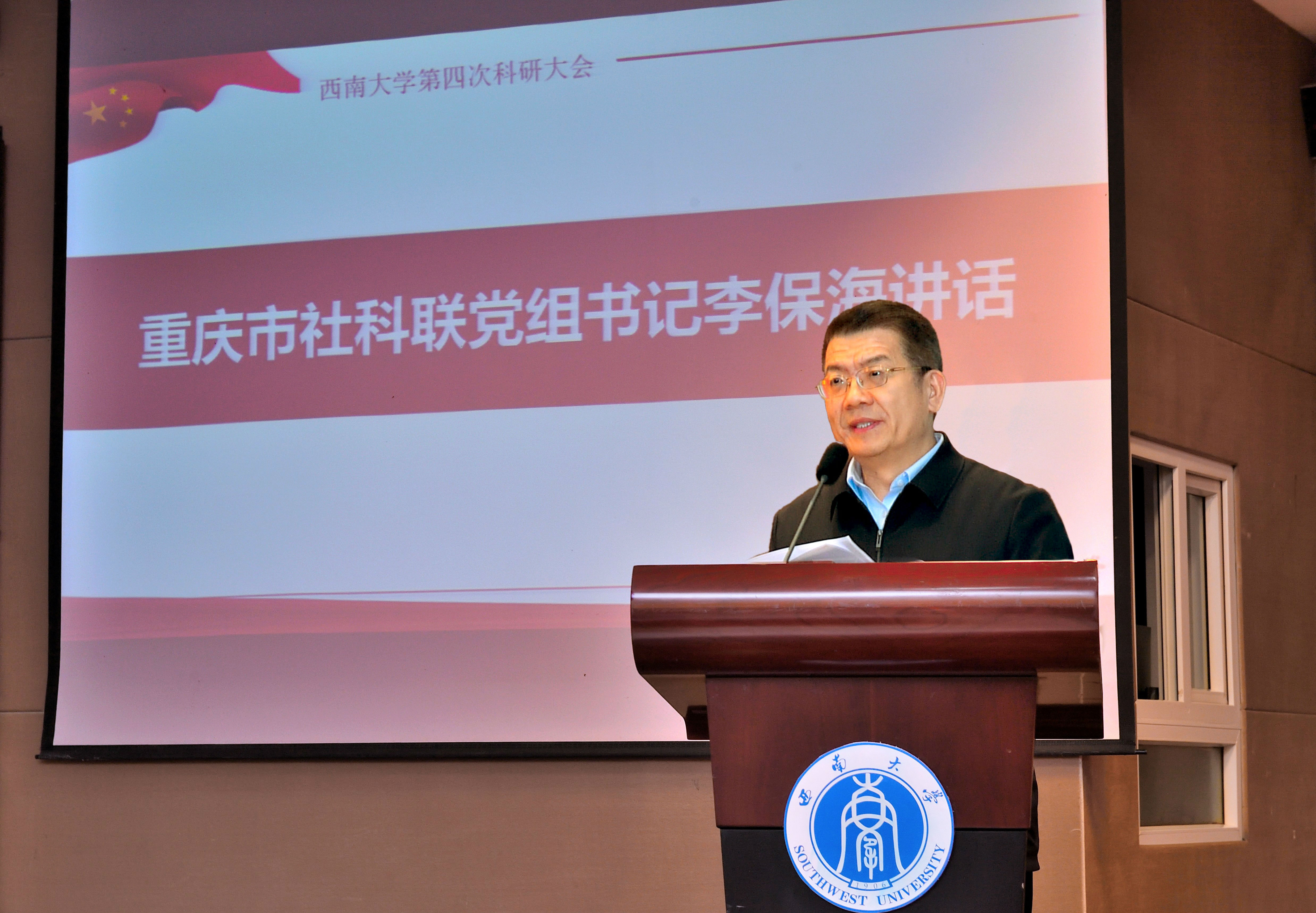 重庆市社科联党组书记李保海发表重要讲话,他肯定了学校十三五期间在哲学社会科学领域取得的佳绩,希望学校进一步统一思想,凝聚力量,深入学习贯彻十九届六中全会精神;强化理论研究,努力夯实哲学社会科学的发展根基;发挥科研育人功能,促进高层次人才培养;推动成果转化,强化资政服务,充分发挥哲学社会科学思想库作用。