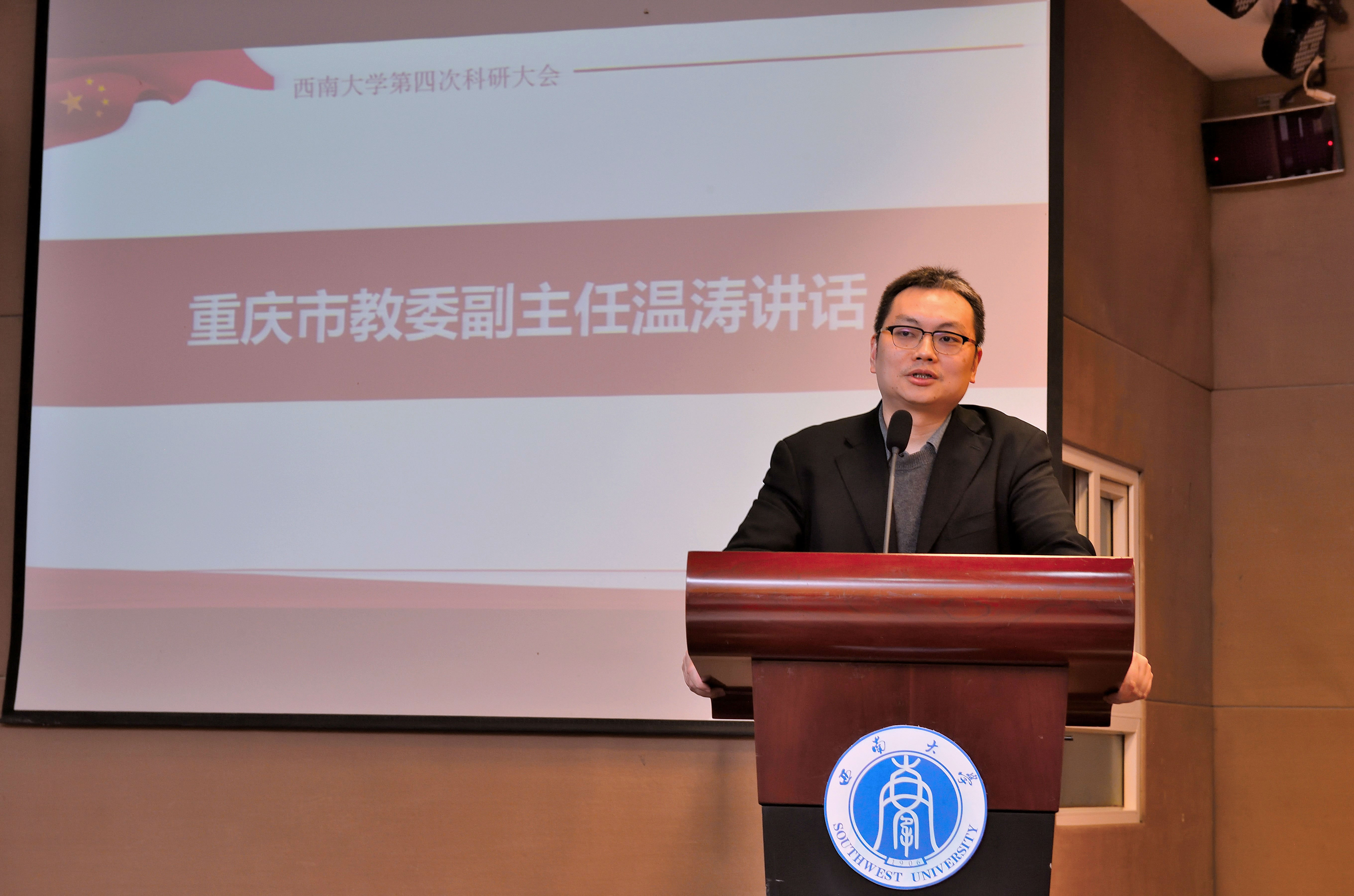 重庆市教委副主任温涛在讲话中充分肯定科研大会对学校二级单位及科研工作者的表彰,强调大会将会对学校科研工作有极大促进作用。他还结合自己在学校的多年工作经历,谈了4点感受,希望学校能够精细化管理,通过专家、团队与管理部门的通力合作,实现科研工作“里子”和“面子”的双丰收;讲好科研故事,挖掘项目、平台、成果等科研资源;找准未来发展方向,精心培育青年人才等国家战略科技力量;立好新标,激发学校的科研创新活力。
