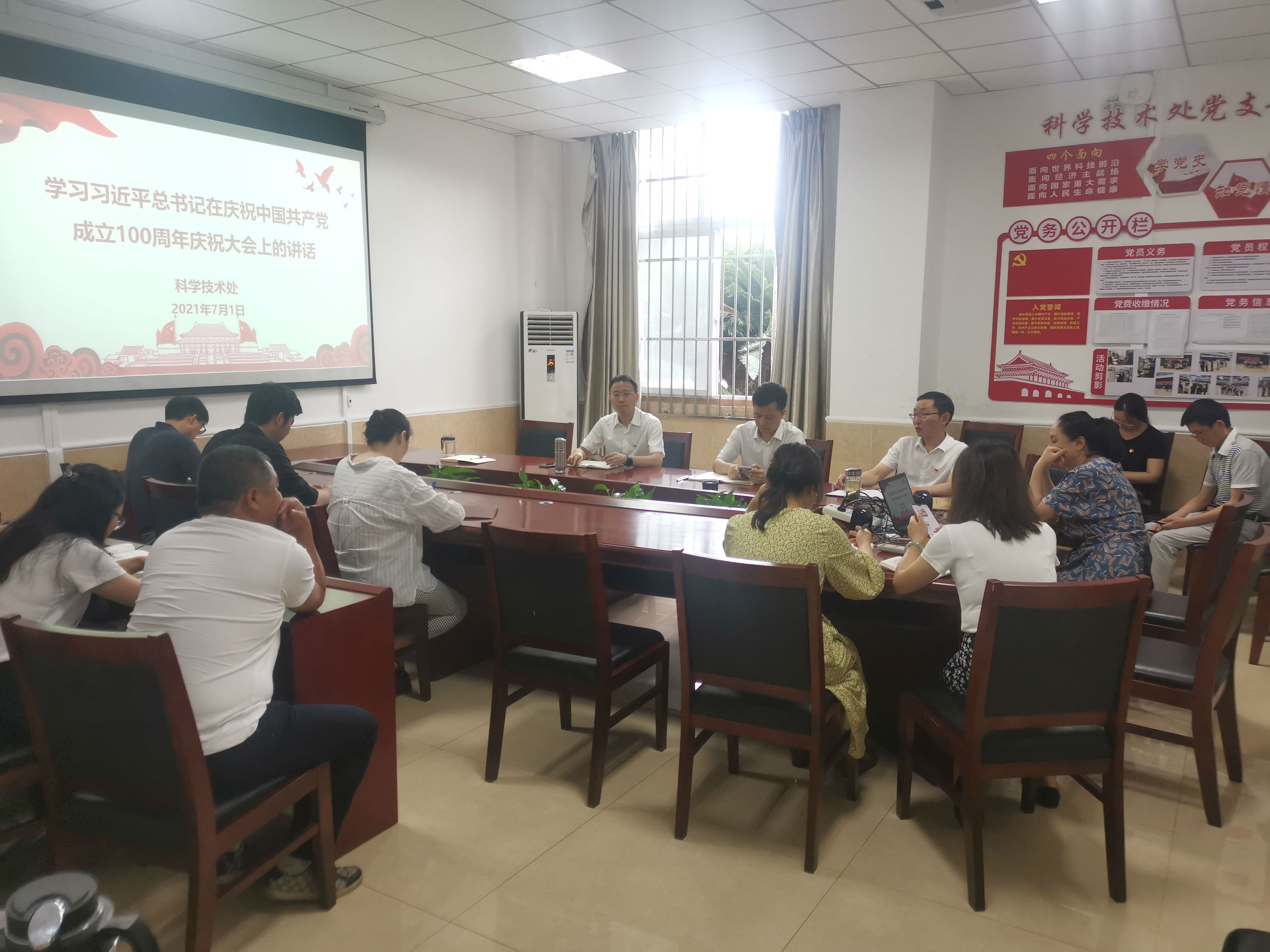 7月1日上午8时,庆祝中国共产党成立100周年大会在北京隆重举行,中共中央总书记、国家主席、中央军委主席习近平出席大会并发表重要讲话。科学技术处组织全体职工在104会议室集中收看庆祝大会直播盛况。庆祝大会结束后,科学技术处庚即组织全体教职工,针对总书记的重要讲话精神,结合工作实际进行了全面深入研讨。