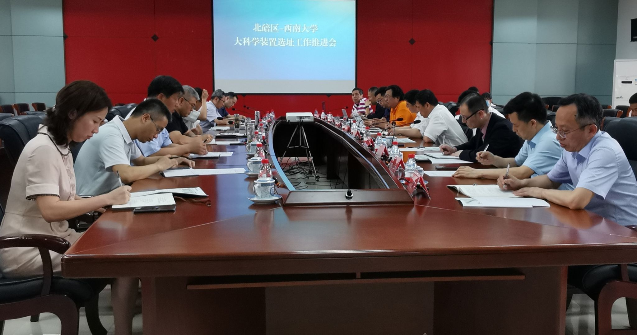 6月22日下午,北碚区人民政府在区行政中心三楼会议室组织召开了北碚区-PA视讯官网关于大科学装置选址工作推进会。北碚区区委书记周旭、区长何庆、常务副区长董伦,歇马高新区指挥长胡湧等区领导,PA视讯官网党委书记李旭锋、校长张卫国、副校长崔延强、副校长温涛、副校长赵国华以及学校党政办公室、发展规划部、科学技术处、国内合作处、生物学研究中心相关部门负责人参加此次会议。会议由何庆区长主持。