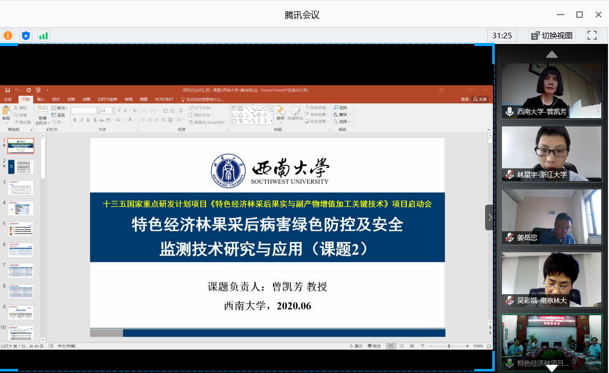6月19日下午,课题牵头单位PA视讯官网组织子课题参与单位广州粒上皇食品有限公司、华中农业大学、南京林业大学和浙江大学进行课题二“特色经济林果采后病害绿色防控及安全监测技术研究与应用”线上课题启动会,会议由课题负责人曾凯芳教授主持。曾凯芳教授首先就如何达到原始创新与产业化应用的平衡、自主知识产权和成果共享的平衡、完成考核指标和形成标志成果的平衡这三个平衡对各子课题单位提出期望。随后,各子课题单位根据项目启动会上项目组织单位和与会专家提出的建议和意见,就各自负责的子课题前期研究进展、后续实施方案、存在困难、组织管理和合作交流前景等进行了研讨。南京林业大学吴彩娥教授和浙江大学罗自生教授对课题具体实施过程中各子课题单位的研究侧重点、注意事项等方面提出了宝贵意见。最后,曾凯芳教授就课题经费的管理和使用进行了简要说明。