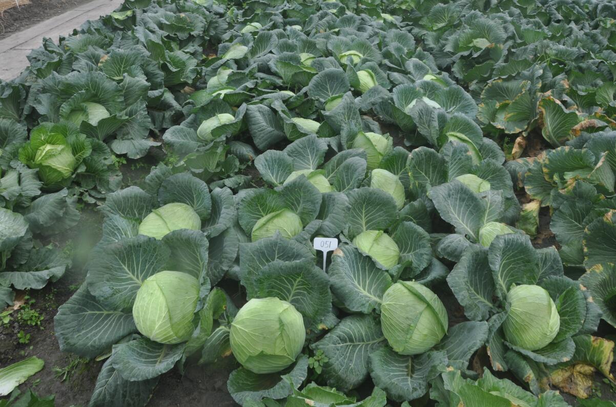 该甘蓝新组合“051”耐高温,耐裂球,田间抗黑腐病,品质优良,叶球扁圆形,外叶蜡粉重,叶球绿色。该组合先后在重庆、四川、北京、广州、武汉等地区进行区域试验或试种栽培,综合性状表现优良,品种适应范围较广,在6月下旬播种,10月下旬采收,属于早熟秋甘蓝品种。该品种的选育成功是重庆地区夏秋栽培甘蓝的有益补充,特别是其耐热、抗黑腐病、耐裂球性是重庆地区夏秋高温季节栽培甘蓝的一大突破,推广价值和生产潜力较大,其选育得到国家重点研发计划“七大农作物”育种以及重庆市社会事业与民生保障科技创新专项项目支持。