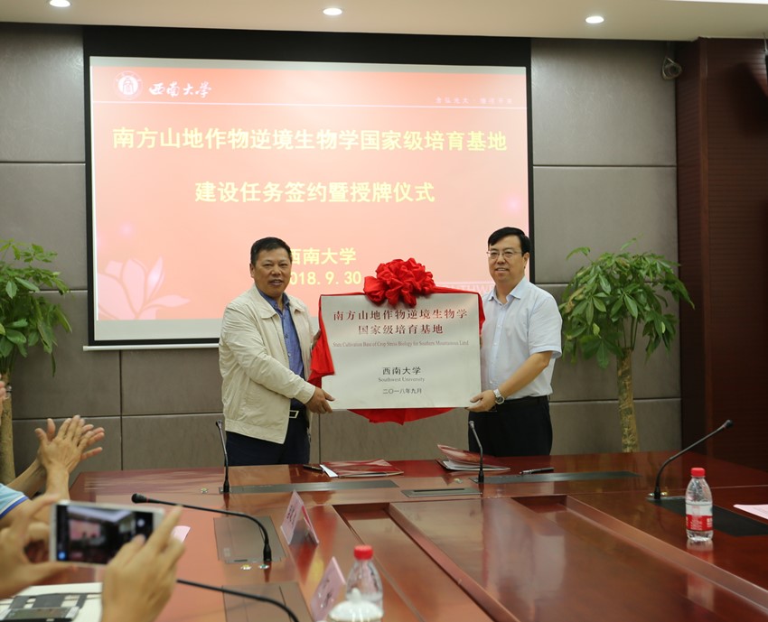 9月30日下午,学校南方山地作物逆境生物学国家级培育基地建设任务签约暨授牌仪式在隆平楼举行。出席仪式的有校长张卫国、副校长周常勇、科技处处长黄承志、农业科学院院长王进军,农学与生物科技学院、园艺园林学院、植物保护学院、柑桔研究所、生物技术中心的专家领导及“PA视讯官网南方山地作物逆境生物学国家级培育基地”(下简称“培育基地”)的部分骨干成员。仪式由黄承志处长主持。