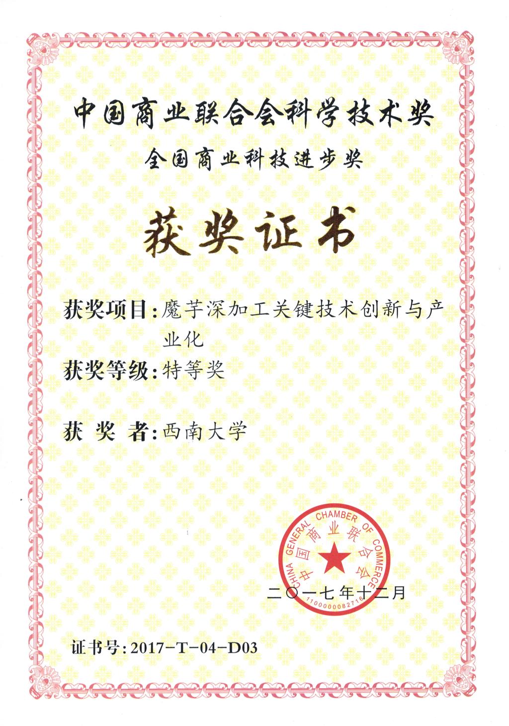 2018年9月17日,中国商业联合会主办的2018年全国商业科技质量大会在北京人民大会堂召开。会上颁布了2017年中国商业联合会科学技术奖评选结果。我校参与的 “魔芋深加工关键技术创新与产业化”成果荣获2017年全国商业科技进步奖特等奖。
